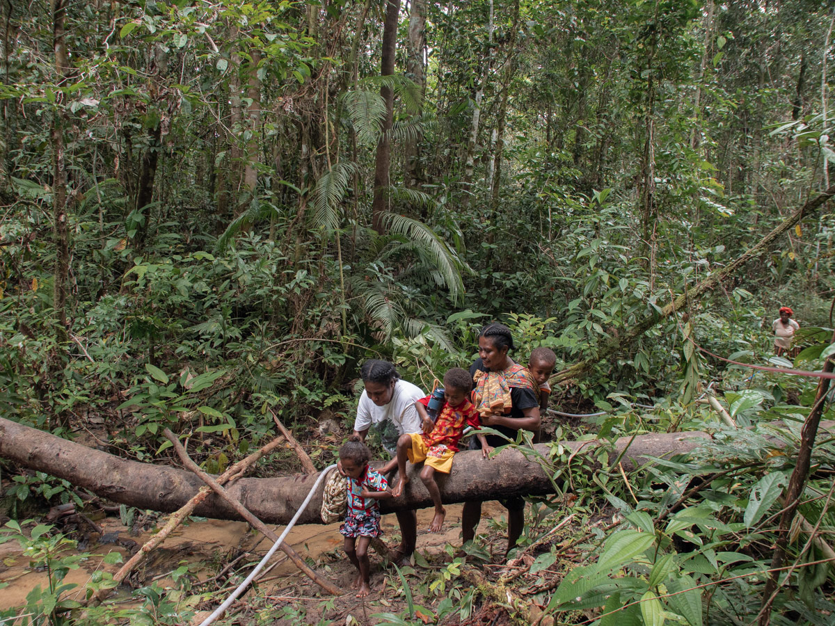 Kna women and children return from tending their gardens in the Sira village forest, Manggroholo-Sira sub-district, South Sorong district, Southwest Papua, September 21, 2023