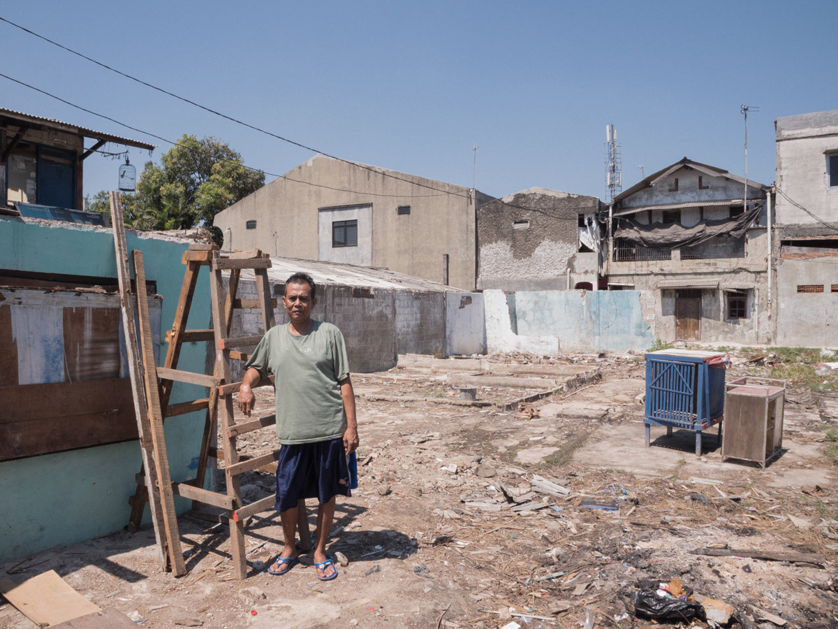Mr. Yasin (48) was photographed on the ruins of his rented house which collapsed several months ago in the Cakung area, North Jakarta. The 118 rented rooms have been empty since 2015 following the widespread relocation of factories from KBN Cakung.